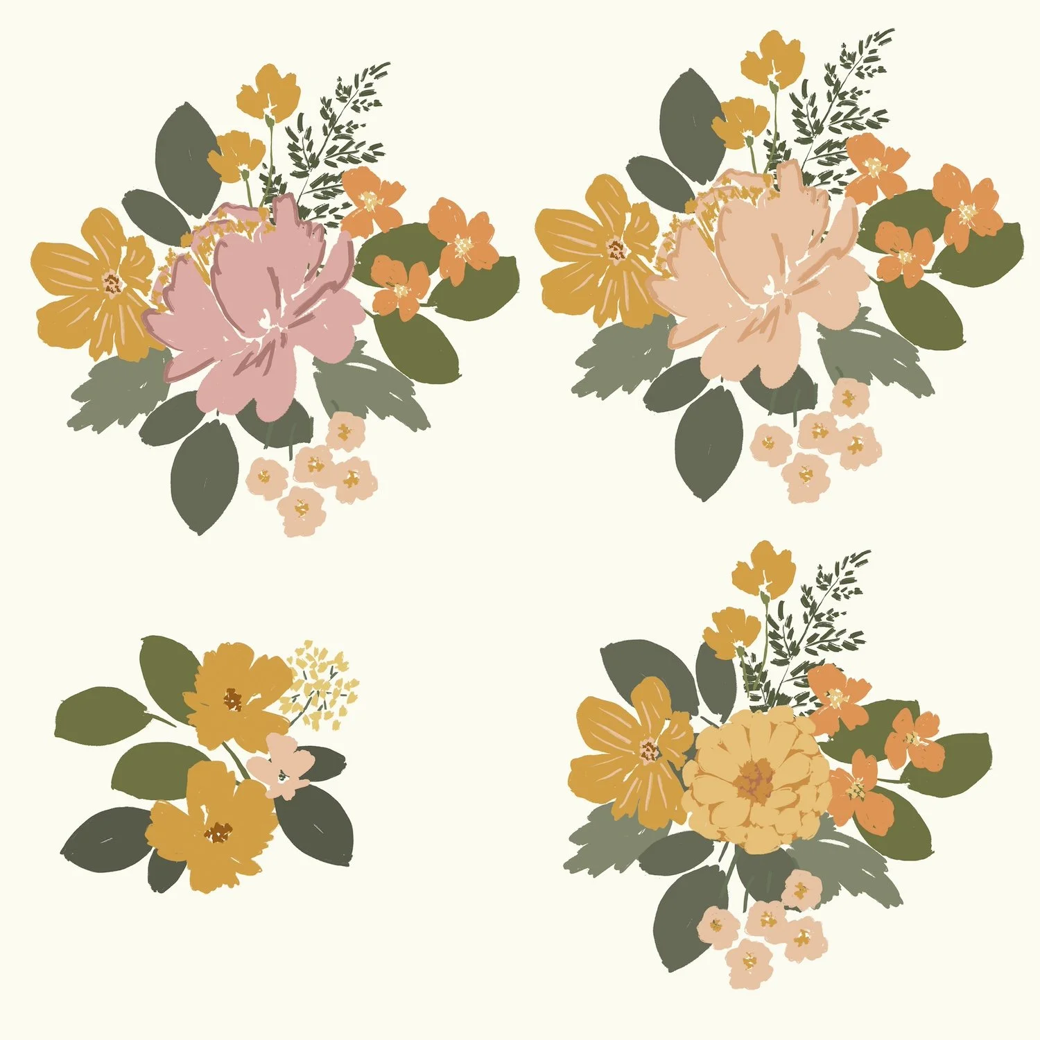 From the initial sketches to selecting flowers, layouts, and colors, every step of the process was a labor of love. We decided on a main floral design and 2 coordinating designs. They are perfect for sibling sets or by themselves.